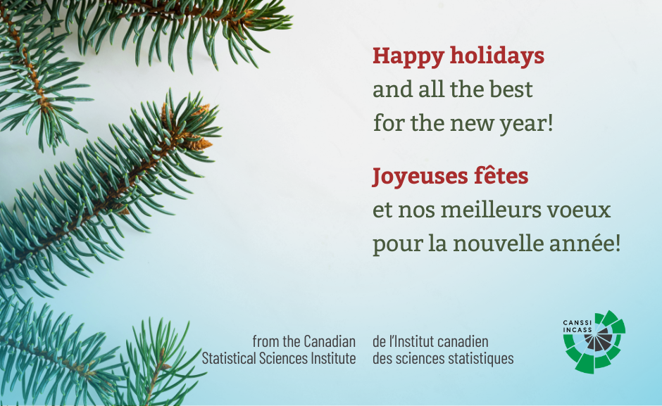 L’année touche à sa fin, et nous sommes reconnaissants pour les nombreuses occasions que nous avons eues de vous rencontrer, d’échanger et de collaborer avec vous afin de renforcer la communauté canadienne des sciences statistiques. Les activités de recherche, de formation et de service que vous entreprenez chaque jour contribuent à résoudre des problèmes dans de nombreux domaines, et nous sommes fiers de soutenir vos efforts.